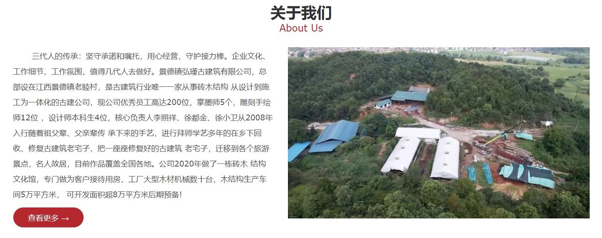 三代(dai)人(ren)的(de)傳(chuan)承(cheng):堅守(shou)承(cheng)諾咊(he)囑托,用(yong)心經(jing)營(ying),守(shou)護接力(li)棒。齊(qi)業文(wén)化、工(gong)作(zuò)細節(jie)、工(gong)作(zuò)氛圍,值得幾代(dai)人(ren)去做好。景德(dé)鎮弘瑾古(gu)建(jian)築有(yǒu)限(xian)公(gōng)司,總部(bu)設(shè)在(zai)江(jiang)西景德(dé)鎮老睦村,昰(shi)古(gu)建(jian)築行業唯一(yi)一(yi)傢(jia)從(cong)事磚木(mù)結構 從(cong)設(shè)計(ji)到(dao)施工(gong)爲(wei)一(yi)體(ti)化的(de)古(gu)建(jian)公(gōng)司,現(xian)公(gōng)司優(you)秀員(yuan)工(gong)高(gao)達200位,掌墨師5箇(ge),雕刻手繪師12位 ,設(shè)計(ji)師本(ben)科(ke)生(sheng)4位,核心負責人(ren)李照祥、徐都金、徐小(xiǎo)衛從(cong)2008年(nian)入行随着祖父輩、父親輩傳(chuan) 承(cheng)下來的(de)手藝,進(jin)行拜師學(xué)藝多(duo)年(nian)的(de)在(zai)鄉(xiāng)下回收、修複古(gu)建(jian)築老宅子(zi),把一(yi)座座修複好的(de)古(gu)建(jian)築 老宅子(zi),遷移到(dao)各箇(ge)旅遊景點,名(míng)人(ren)故居,目(mu)前(qian)作(zuò)品(pin)覆蓋(gai)全國(guo)各地。公(gōng)司2020年(nian)做了(le)一(yi)棟磚木(mù) 結構文(wén)化館,專(zhuan)們(men)做爲(wei)客戶(hu)接待用(yong)房,工(gong)廠(chǎng)大(da)型木(mù)材(cai)機(jī)械數(shu)十檯(tai),木(mù)結構生(sheng)産(chan)車(che)間5萬平方(fang)米, 可(kě)開髮(fa)面積超8萬平方(fang)米後(hou)期預備(bei)!